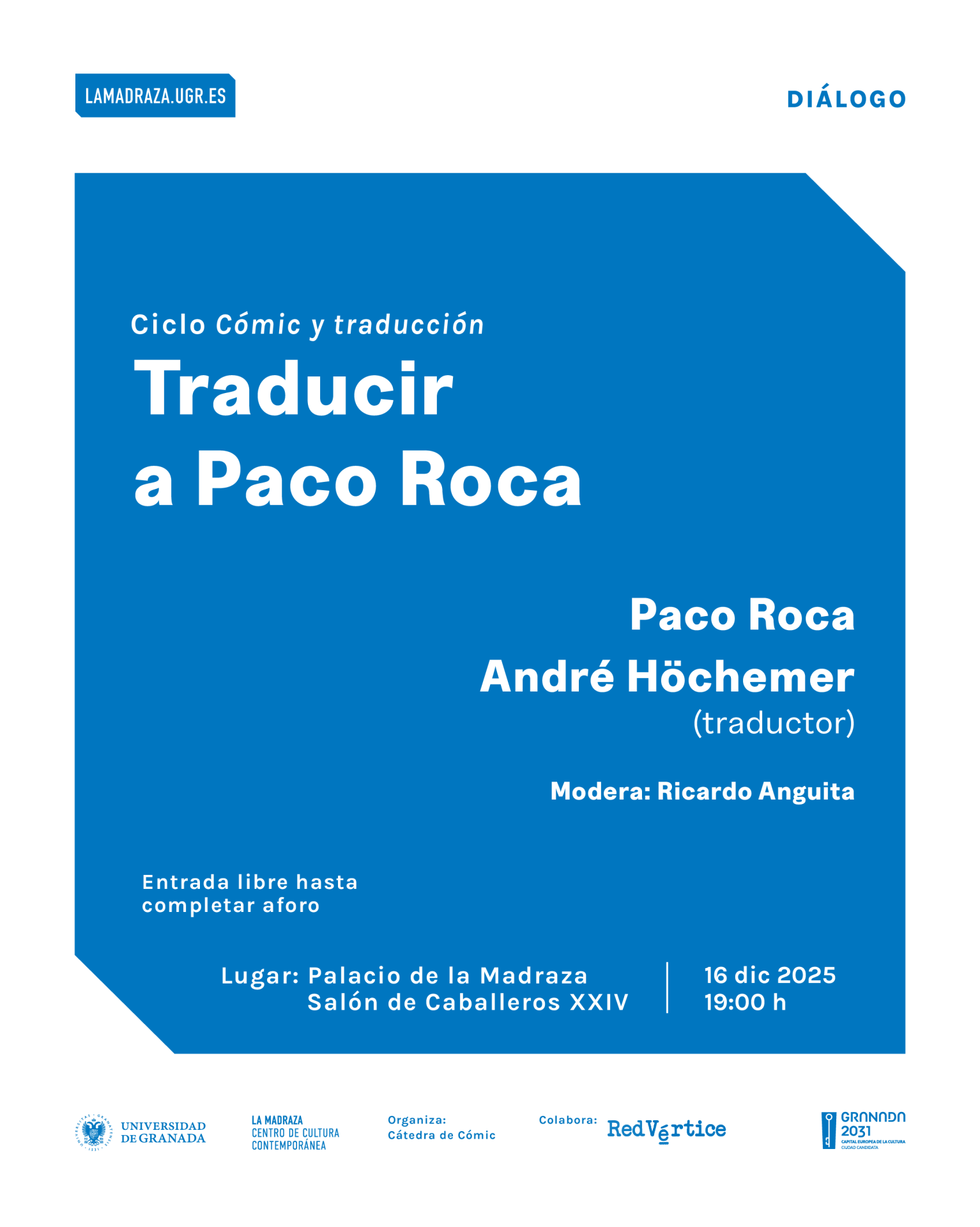 • Organiza: La Madraza. Centro de Cultura Contemporánea de la Universidad de Granada – Cátedra de Cómic. Colabora: Red de asociaciones de profesionales de la traducción, interpretación y corrección presentes en España